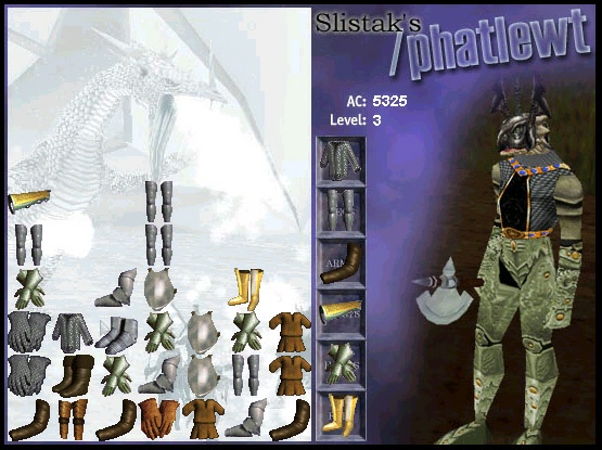 This is a screenshot of a small java applet game I recently wrote. All the graphics were taken from screenshots of my Iksar warrior in Everquest. It plays like a standard columns game. The added goal is to complete Slistak's plate armor. At first only leather pieces will fall for each armor slot. When you've successfully connected 3 of the same armor piece together, they disappear, you get points, and Slistak dons the new armor graphic. Progression goes from leather -> chain -> plate.