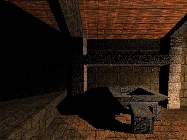 The bumpmaps are generated from the textures, which means that any Quake I level can be displayed. Ok, artist bump maps would be nicer, but I am not a graphix, only a coder. Another drawback is that even watter and lava are bumped. =(