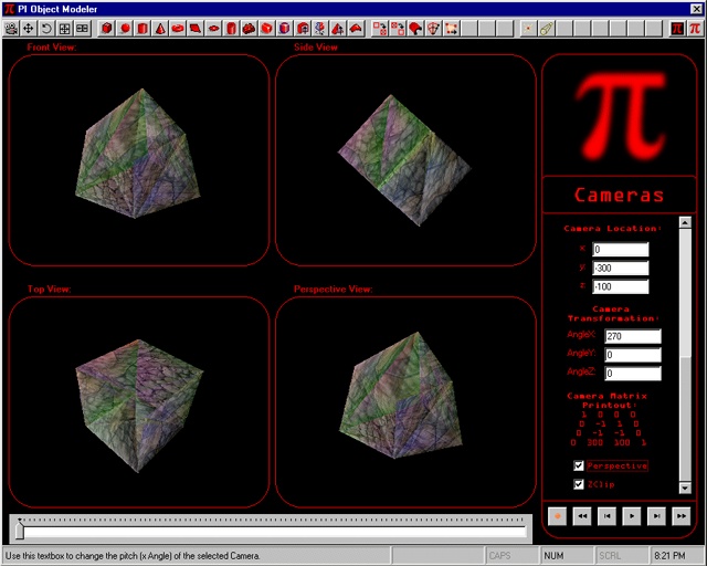 This is a screen shoot from my 3D Object Editor and Animator named PI. When it's finshed, it should have 20+ different rendering modes, all possible through pure _Software_Rasterizing_ (Jacco & Jaap!!) The source code as well as the binaries will also be avaliable upon completion. This screen shoot features Glenzed Perspective Correct Multitextured Shading.