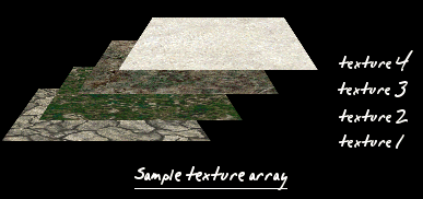 The other two layers of the shader script used by terraVox are two textures that are chosen and mixed together given a texture reference map, which I call ref-map for short. The ref-map has the same format as the light-map, namely a bitmap of greyscale values.![]() We also need a few textures, sorted by index. ![]() By looking up the value of the ref-map, we can easily select the two textures which we must blend, and what alpha coefficient we must use. As an example, let us consider a small area of the landscape, and what part of each texture is used. Note that the algorithm doesn't deal with the texture when the alpha coefficient is zero, since all black areas of the alpha blended textures are not needed. ![]() The major disadvantage with this method is that we won't be able to have an area in the landscape where the textures blend from tex1 to tex4 for example. But we can however get an extremely fast inner loop, which is why I chose this method. |